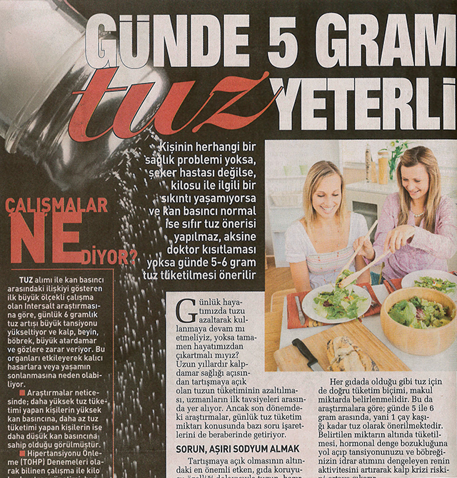 Tuz alımı ile kan basıncı arasındaki ilişkiyi gösteren ilk büyük ölçekli çalışma olan Intersalt araştırmasına göre, günlük 6 gramlık tuz artışı büyük tansiyonu yükseltiyor ve kalp, beyin, böbrek, büyük atardamar ve gözlere zarar veriyor. Bu organları etkileyerek kalıcı hasarlara veya yaşamın sonlanmasına neden olabiliyor.