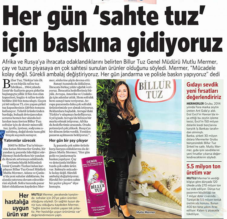 İç pazarda çok sahte ürünle karşı karşıya olduklarına da değinen Mutlu Mermer, "Her gün polis ve jandarmayla baskın yapılıyor. Çay ve deterjanla birlikte tuzda çok sahte ürün var. Sahteyle mücadele kolay değil. Sürekli ambalaj değiştiriyoruz. Sürekli bir yerden sahte bir şeyler çıkıyor" diye konuştu.