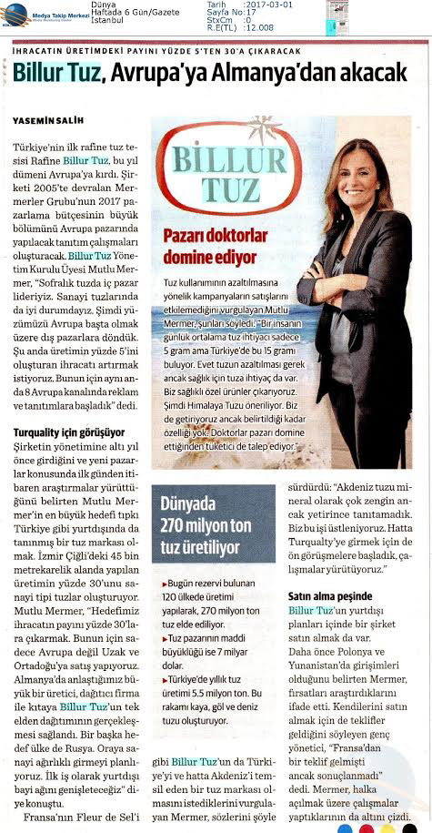 Türkiye'nin ilk rafine tuz tesisi Rafine Billur Tuz, bu yıl dümeni Avrupa'ya kırdı. Şirketi 2005'te devralan Mermerler Grubu'nun 2017 pazarlama bütçesinin büyük bölümünü Avrupa pazarında yapılacak tanıtım çalışmaları oluşturacak. Billur Tuz Yönetim Kurulu Üyesi Mutlu Mermer, "Sofralık tuzda iç pazar lideriyiz. Sanayi tuzlarında da iyi durumdayız. Şimdi yüzümüzü Avrupa başta olmak üzere dış pazarlara döndük. Şu anda üretimin yüzde 5'ini oluşturan ihracatı artırmak istiyoruz. Bunun için aynı anda 8 Avrupa kanalında reklam ve tanıtımlara başladık" dedi.