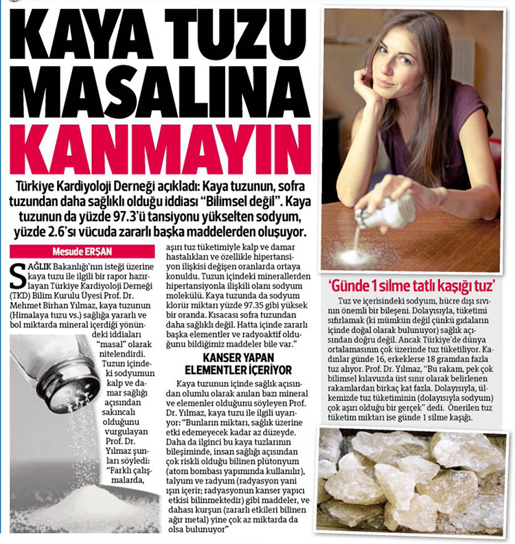 SAĞLIK Bakanlığı’nın isteği üzerine kaya tuzu ile ilgili bir rapor hazırlayan Türkiye Kardiyoloji Derneği (TKD) Bilim Kurulu Üyesi Prof. Dr. Mehmet Birhan Yılmaz, kaya tuzunun (Himalaya tuzu vs.) sağlığa yararlı ve bol miktarda mineral içerdiği yönündeki iddiaları "masal" olarak nitelendirdi. Tuzun içindeki sodyumun kalp ve damar sağlığı açısından sakıncalı olduğunu vurgulayan Prof. Dr. Yılmaz şunları söyledi: "Farklı çalışmalarda, aşırı tuz tüketimiyle kalp ve damar hastalıkları ve özellikle hipertansiyon ilişkisi değişen oranlarda ortaya konuldu. Tuzun içindeki minerallerden hipertansiyonla ilişkili olanı sodyum molekülü. Kaya tuzunda da sodyum klorür miktarı yüzde 97.35 gibi yüksek bir oranda. Kısacası sofra tuzundan daha sağlıklı değil. Hatta içinde zararlı başka elementler ve radyoaktif olduğunu bildiğimiz maddeler bile var."